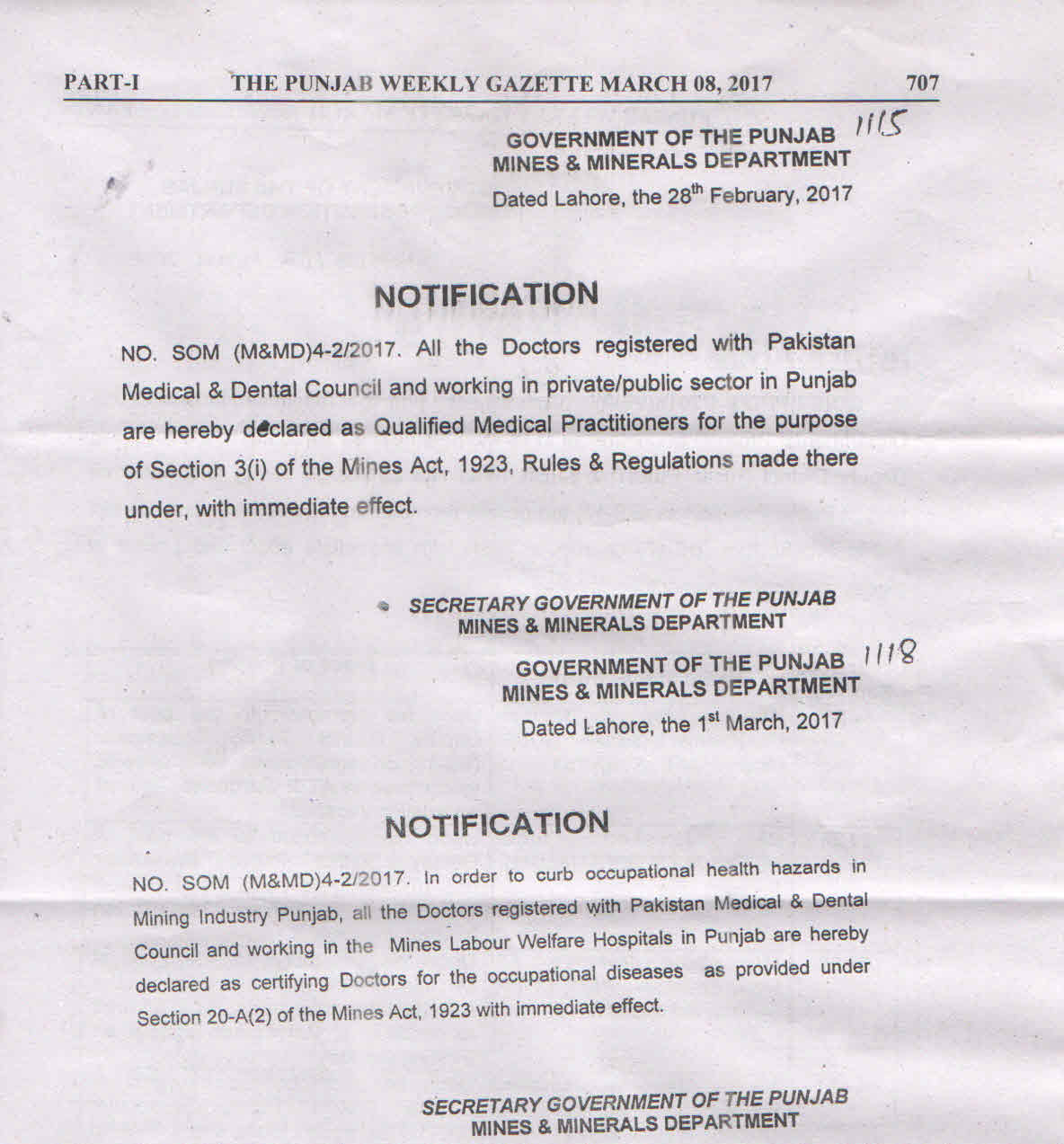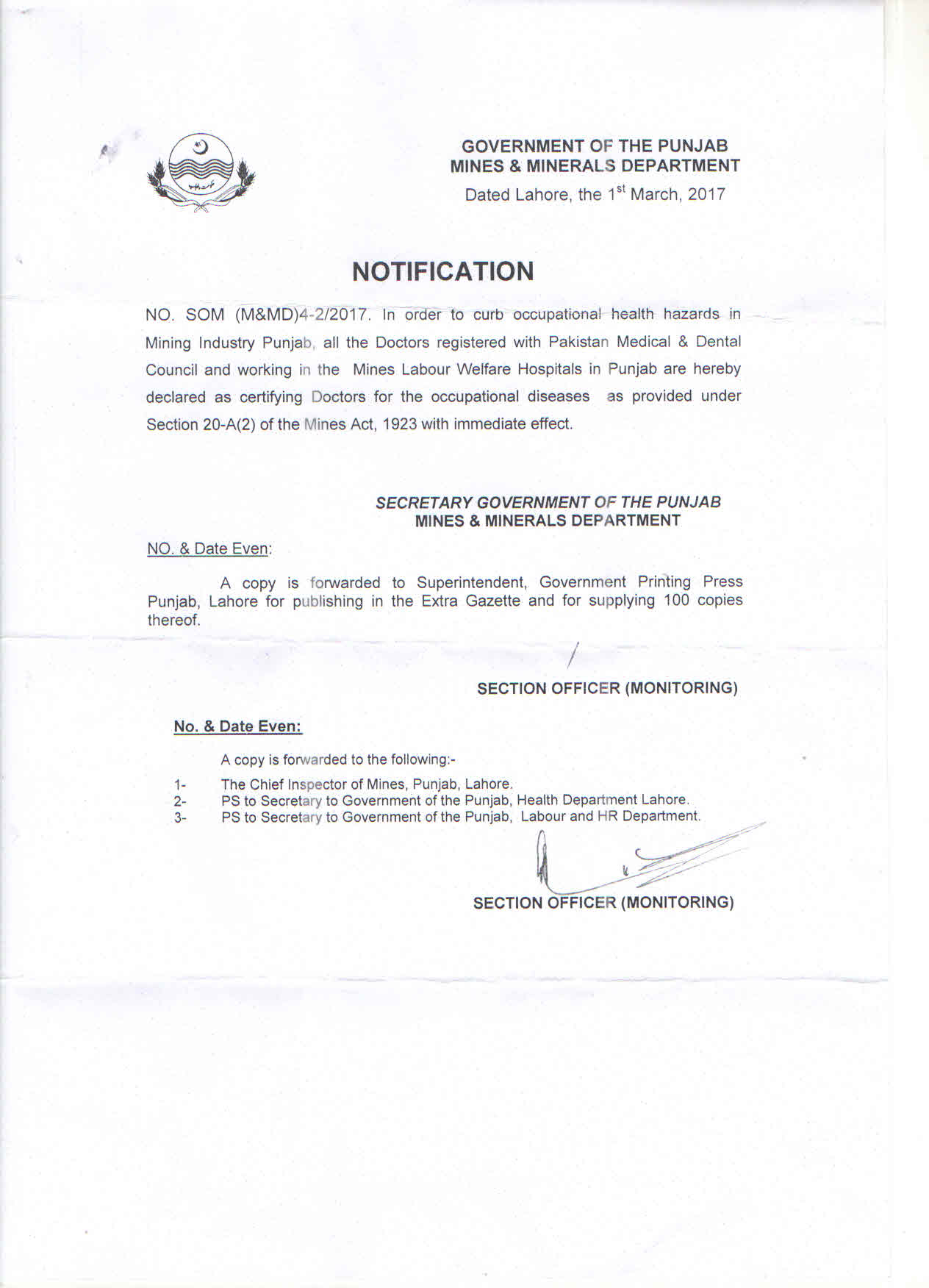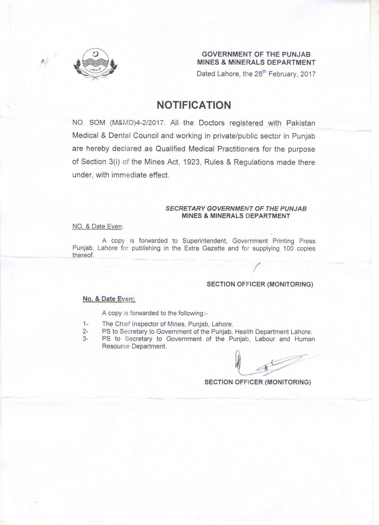 Notification of Qualified Medical Practitioners. - (Gazette Copy) Dated: February 28, 2017 Notification of Certifying Doctors - (Gazette Copy) Dated: March 01, 2017